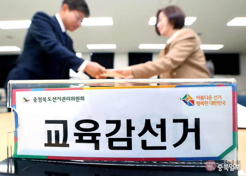 오는 6월 3일 치러지는 9회 전국동시지방선거를 앞두고 충북지사 및 교육감 선거 예비후보자 등록이 진행 중인 가운데 5일 오전 청주시 흥덕구 충북도선거관리위원회에서 충북도교육감 선거에 출마한 예비후보자가 등록 서류를 접수하고 있다.