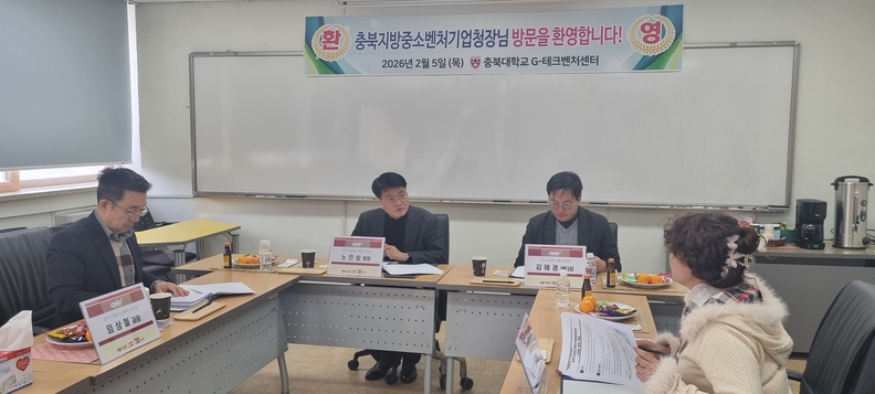 노진상(왼쪽에서 두 번째) 충북중기청장이 5일 충북대 G-테크벤처센터를 방문하고 센터 운영 현황과 입주기업 애로사항을 청취하고 있다.