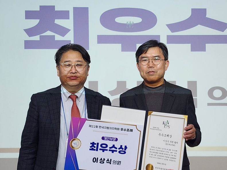이상식(오른쪽) 충북도의원이 5일 한국지방자치학회가 주관한 22회 우수 조례 시상식에서 개인부문 최우수상을 받은 뒤 기념사진을 찍고 있다.