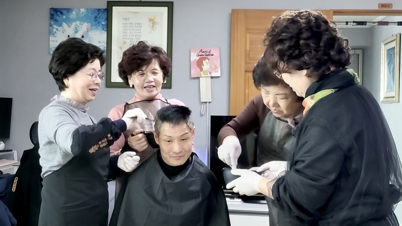 청주농협 이·미용 봉사 회원들이 관내 복지시설에서 봉사활동을 하고 있다.