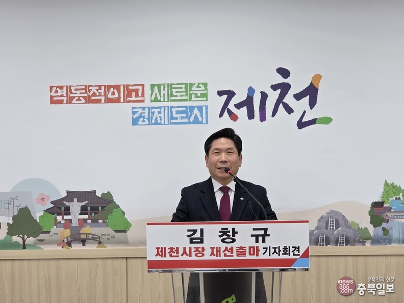 김창규 제천시장이 기자회견을 열어 민선 9기 제천시장 선거 출마를 공식 선언하고 있다.