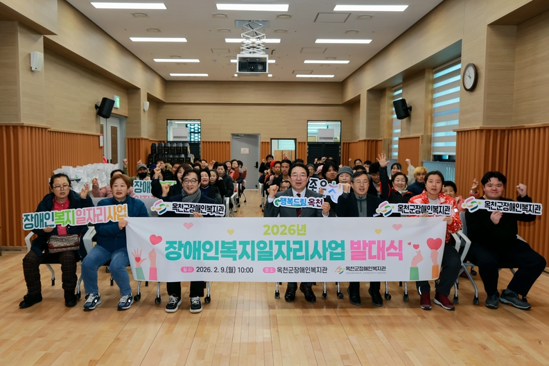 9일 옥천군장애인복지관에서 열린 ‘2026년 장애인복지 일자리사업 발대식’에서 참여자와 관계자들이 일자리 참여 의지를 다지며 기념촬영을 하고 있다.