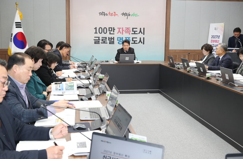 신병대 청주부시장이 9일 정부예산 확보 발굴 보고회를 주재하고 있다.