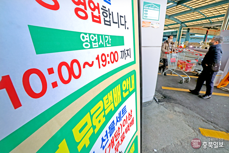 최근 쿠팡 사태 등을 계기로 정부와 여당이 유통산업발전법 개정을 추진하면서 대형마트의 새벽배송 허용 여부가 논의되고 있다. 9일 청주의 한 대형마트에 택배 배송 안내문이 게시돼 있다.