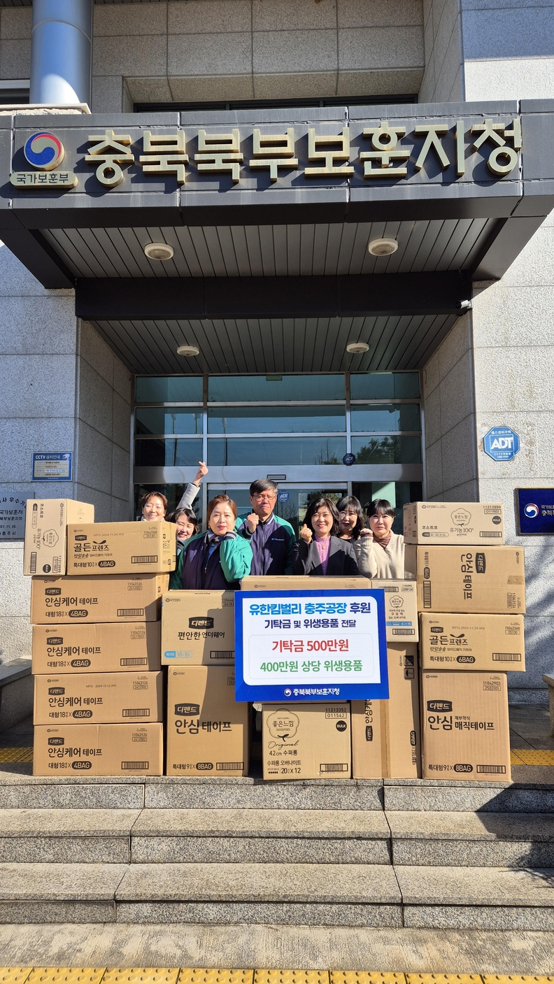 유한킴벌리 충주공장과 충북북부보훈지청 관계자가 보훈가족에 전달할 물품 앞에서 기념사진을 찍고 있다.