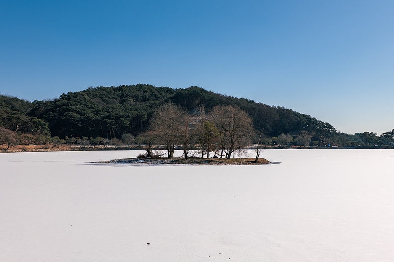 의림지에 도착해 가장 먼저 마주한 것은 광활하게 펼쳐진 순백의 평원이다. 평소 잔잔한 물결이 일며 윤슬을 내뿜던 호수는 이제 두꺼운 얼음옷을 겹겹이 입었고, 그 위로 갓 내려앉은 눈이 보드랍게 쌓여 있다. 호수 전체가 하나의 거대한 하얀 캔버스가 된 듯한 광경은, 인위적인 조형물로는 결코 흉내 낼 수 없는 대자연의 경외감과 위엄을 고스란히 보여준다.