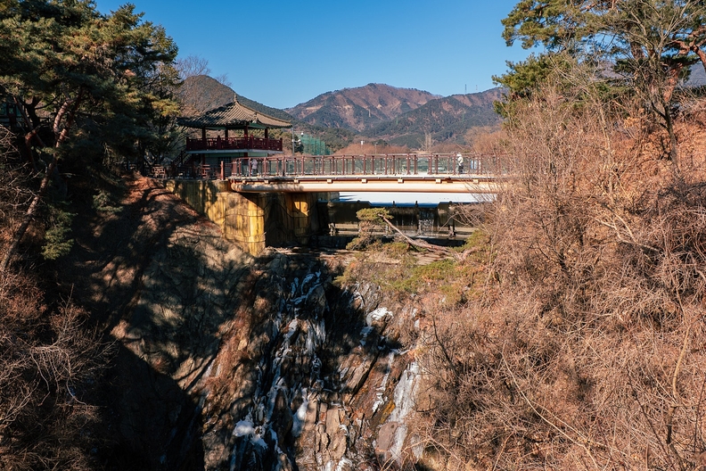 평소라면 시원한 굉음을 내며 쏟아졌을 용추폭포도 꽁꽁 얼어 그대로 멈췄다. 힘차게 흐르던 물줄기가 얼어붙어 시간이 그대로 박제된 듯한 신비로운 모습은, 오직 이 계절 겨울의 의림지에서만 만날 수 있는 특별한 묘미이자 선물 같은 풍경이다.