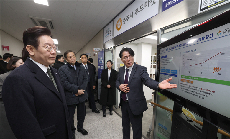 이재명 대통령이 11일 충북 충주시건강복지타운 내 그냥드림 코너를 방문해 운영 현황을 청취하고 있다. '그냥드림'은 정부가 생계에 어려움을 겪는 국민을 위해 기본 먹거리·생필품을 지원하는 사업이다.