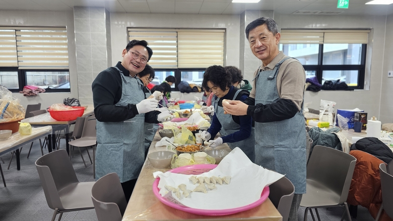 진광주(오른쪽) 중원농협 조합장과 박정호 농협 충주시지부장이 만두를 빚고 있다.
