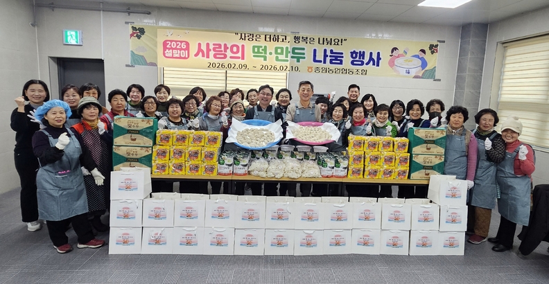 중원농협 임직원과 농가주부모임 희망드림 봉사단 관계자들이 원로조합원과 취약계층에 전달할 명절 꾸러미 앞에서 단체사진을 찍고 있다.
