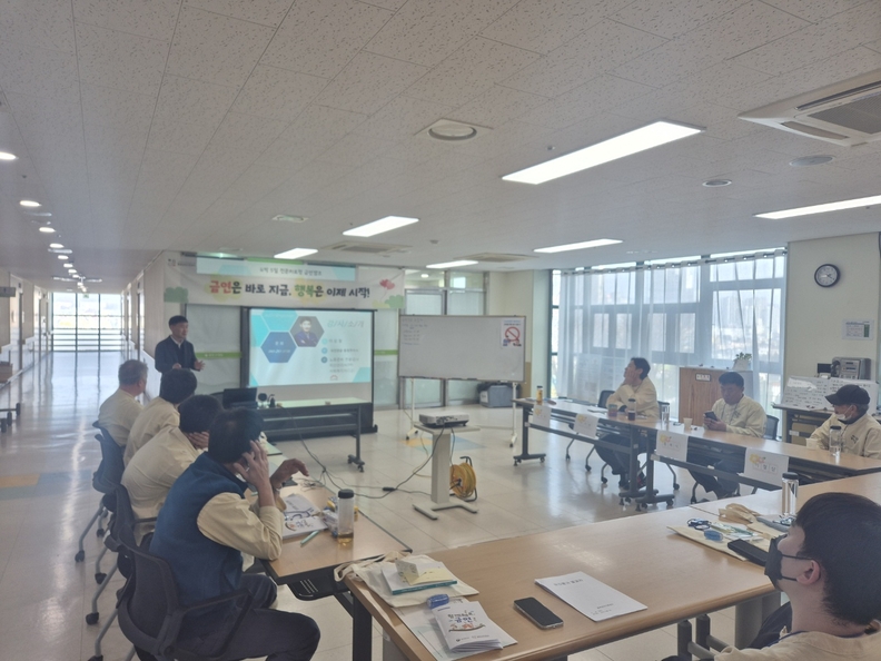 이상철 국민연금 동청주지사 노후준비서비스팀장이 금연캠프 참석자를 대상 으로 노후준비 전문강의를 진행하고 있다.