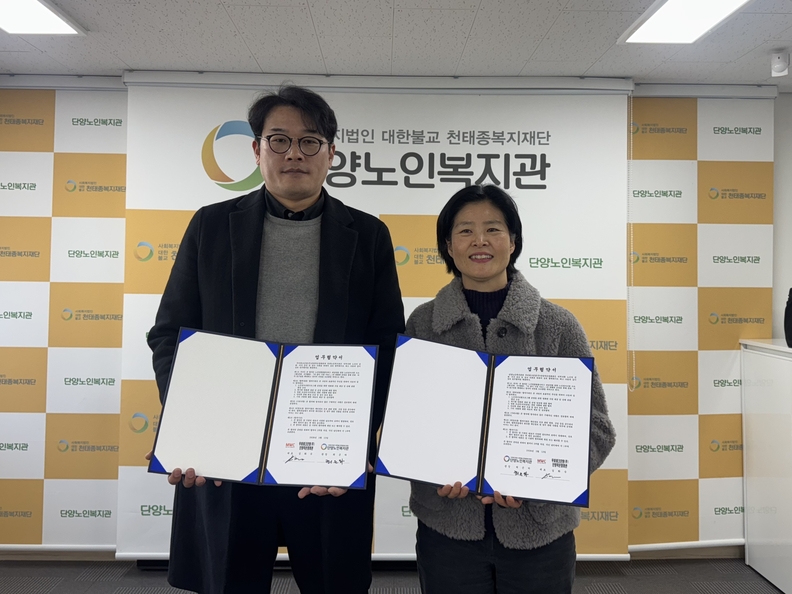 단양노인복지관과 ㈜무비워크단양 대표가 지역사회 노인의 문화와 여가 증진 및 정서 지원 업무협약(MOU)을 체결하고 있다.