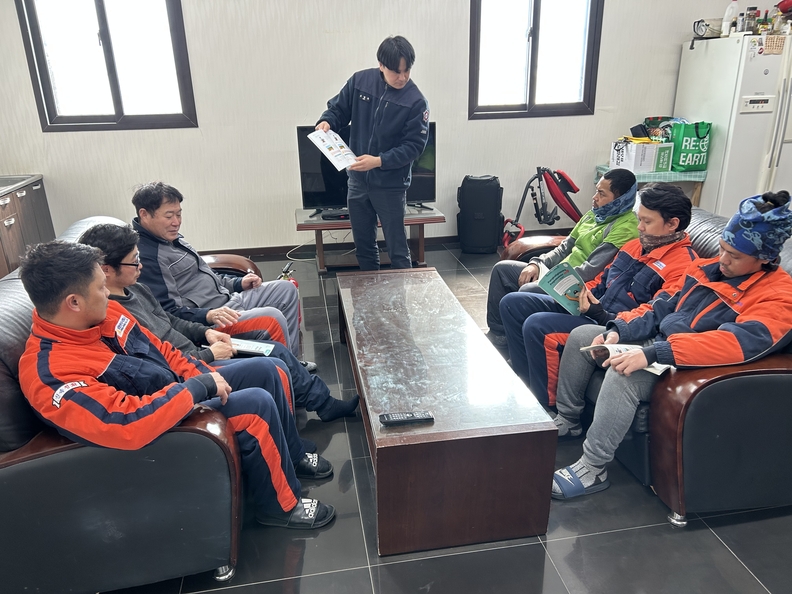 단양소방서 대원이 지역 내 내 외국인 근로자들을 대상으로 화재예방 및 생활안전 교육을 하고 있다.