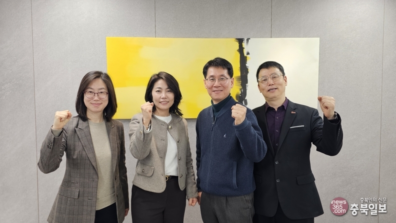 (왼쪽부터) 조윤경 한국수출입은행 충북본부장, 김희영 한국무역협회 충북본부장, 황인탁 중소기업진흥공단 충북지역본부장, 임춘호 중소기업중앙회 충북지역본부장으로 구성된 '충북 수출 얼라이언스'팀이 기념촬영하고 있다.