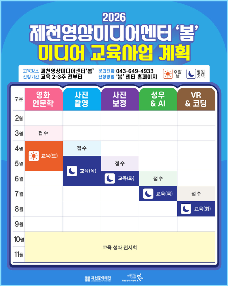 제천영상미디어센터가 올 한해 운영하는 지역 시민을 위한 '봄' 미디어 교육 연간 일정.