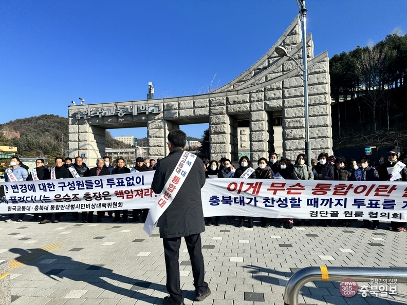 교통대 총동문회와 통합반대 범시민비상대책위, 교통대 인근 상인회 관계자들이 교통대와 충북대 통합에 반대하는 기자회견을 갖고 있다.