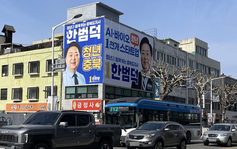 24일 문을 연 더불어민주당 한범덕 충북지사 예비후보 선거사무소에 대형 현수막이 걸려 있다.
