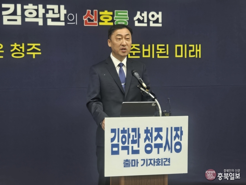 김학관 전 충북경찰청장이 25일 청주시청 브리핑룸에서 청주시장 선거 출마 기자회견을 하고 있다.