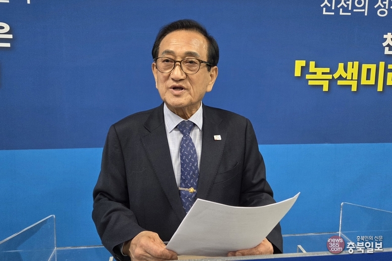 박양규 전 진천군의회의장이 25일 진천군청 브리핑룸에서 기자회견을 열어 6·3 지방선거 더불어민주당 소속 진천군수 후보 출마를 선언하고 있다.