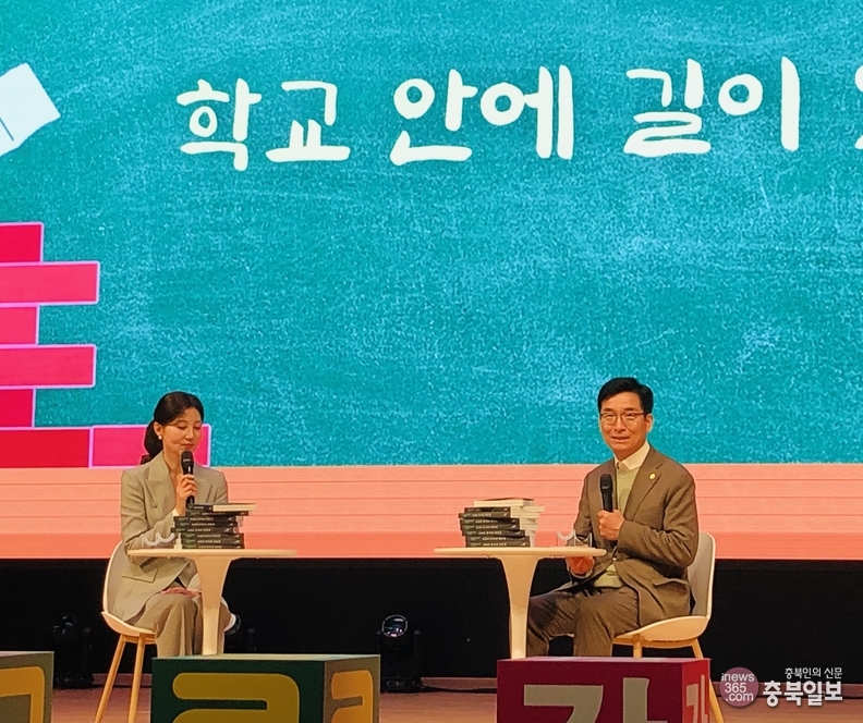 윤건영(오른쪽) 충북교육감이 28일 오전 충북대학교 개신문화관에서 가진 출판기념회에서 참석자들과 토크콘서트를 하고 있다.