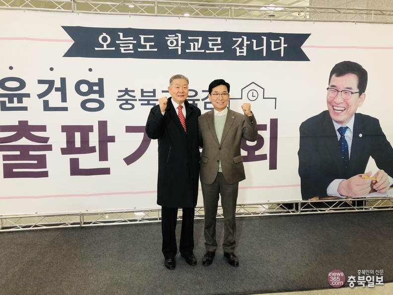 윤건영(오른쪽) 충북교육감이 28일 오전 충북대학교 개신문화관에서 가진 출판기념회에서 이기용 전 충북교육감과 기념사진을 찍고 있다.