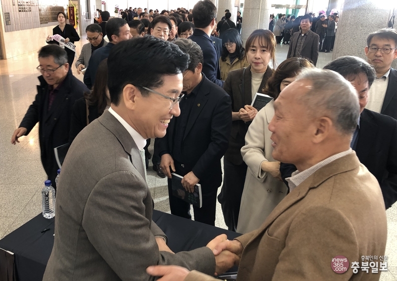 윤건영(왼쪽) 충북교육감이 28일 오전 충북대학교 개신문화관에서 가진 출판기념회에서 사인회를 갖고 참석자들과 인사를 나누고 있다.