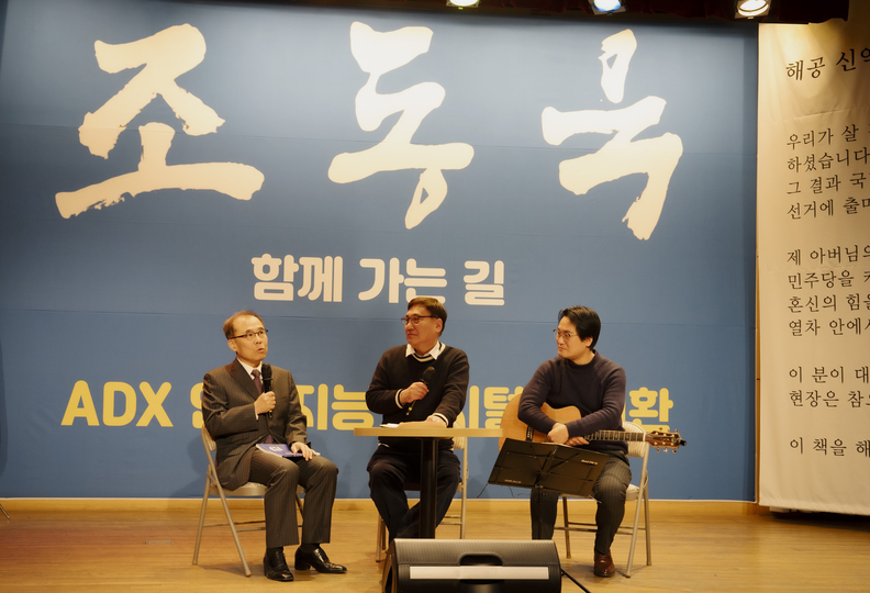 조동욱(가운데) 전 충북도립대학교 교수가 지난달 28일 충북기업진흥원에서 '조동욱의 과학이야기-아하, 그런 거 였어!' 출간을 기념하는 북 콘서트를 열고 있다.