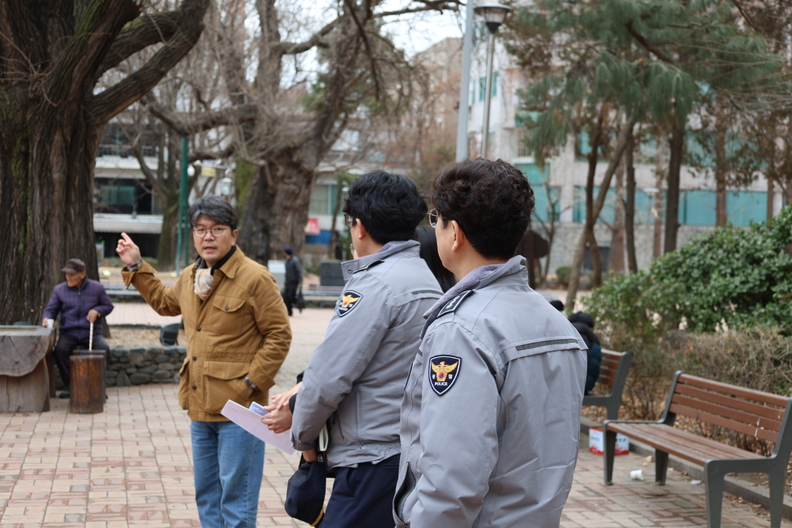 청주상당경찰서·청주시청·건축공간연구원이 최근 중앙공원에서 윷놀이 도박 등 무질서 행위 근절을 위한 'CPTED' 합동 정밀 진단을 실시하고 있다.
