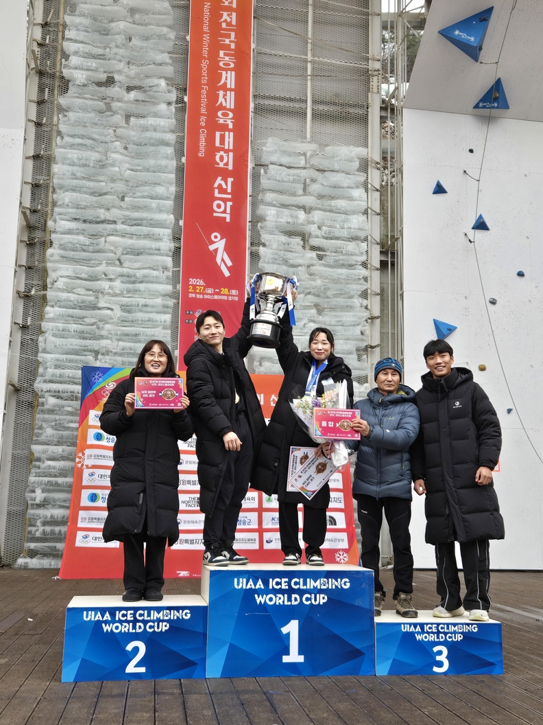 107회 전국 동계체육대회 산악 종합 1위에 오른 충북 선수단이 우승을자축하고 있다. (왼쪽부터)정미영 감독, 박준규·김혜준·방금석 선수, 임명철 코치.