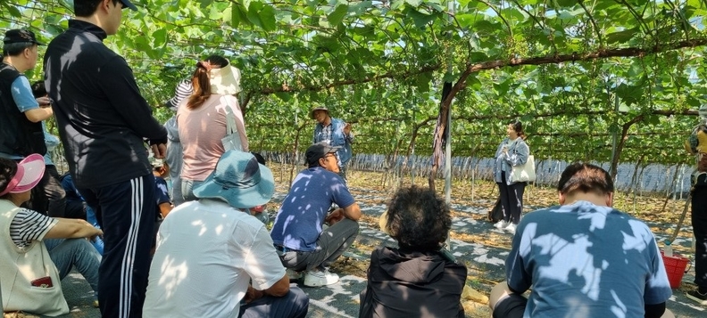 지난해 7월 영동군농업기술센터 기초영농기술교육에 참여한 교육생들이 과원 현장에서 재배 기술 설명을 듣고 있다.