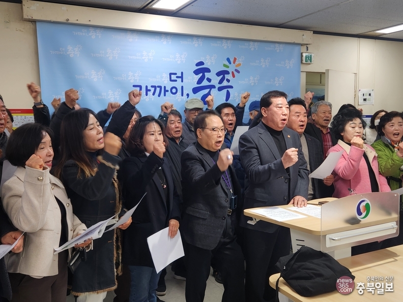 충주 시민단체 관계자들이 충북대와 교통대 통합에 대한 반대 기자회견을 가지며 반대 구회를 외치고 있다.