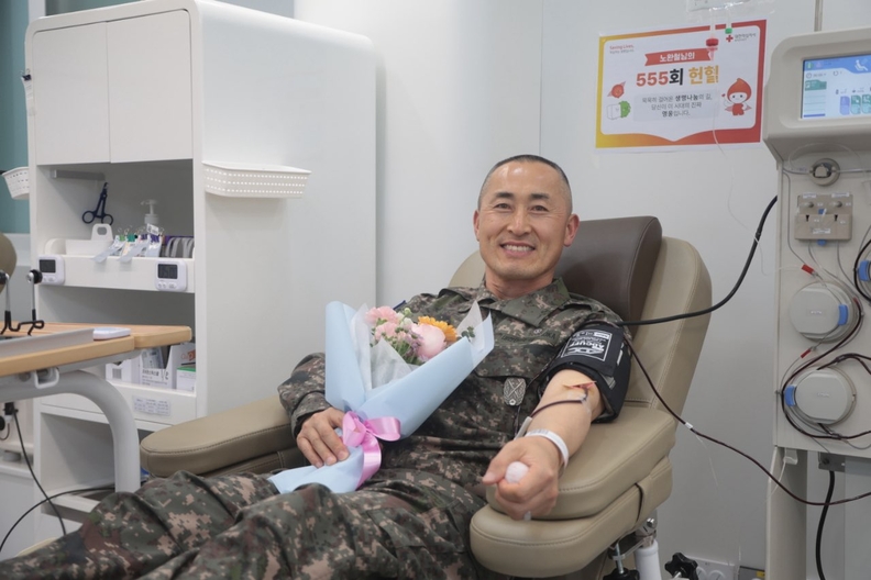 노완철씨가 최근 555번째 헌혈을 하고 있다.