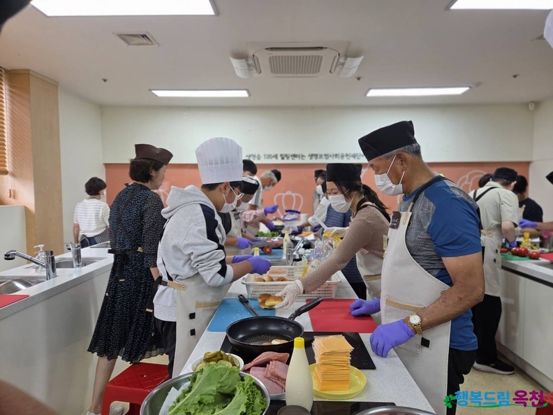 지난해 7월 옥천군노인복지관 생명숲100세힐링센터 요리교실에서 열린 ‘제5회 힐링미식회’에서 어르신들과 옥천중학교 학생들이 ‘할아버지와 함께 만드는 샌드위치’를 주제로 팀을 이뤄 요리를 만들고 있다.