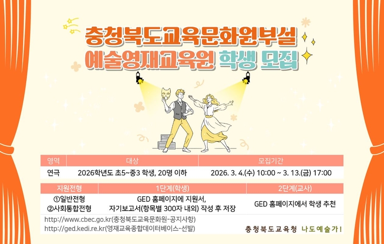 충북교육문화원 부설 예술영재교육원 연극 영재 모집 안내문.