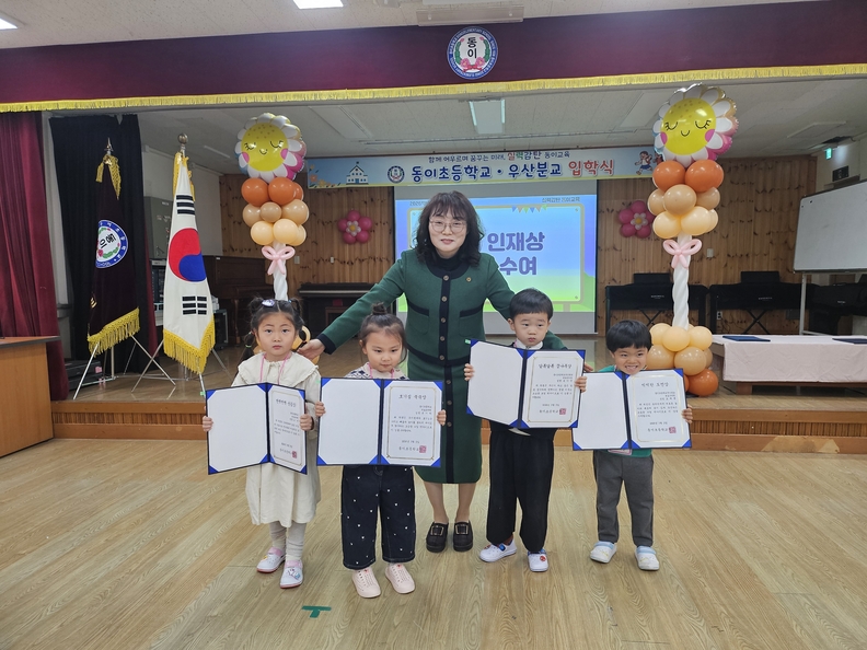 동이초등학교 이숙경 교장이 3일 학교 강당에서 열린 2026학년도 입학식에서 병설유치원 원아들에게 ‘동이초 미래인재상’을 수여한 뒤 기념촬영을 하고 있다.
