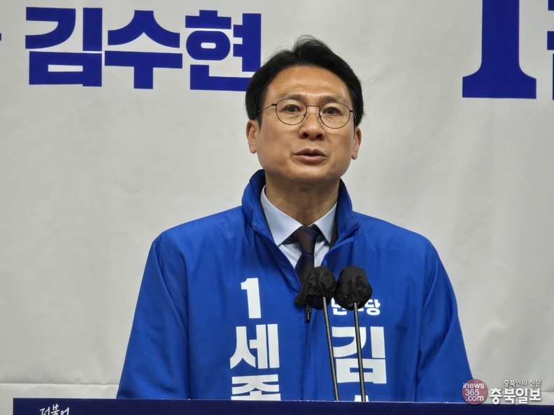 김수현 예비후보가 4일 세종시청에서 '조치원 뉴시티(New-City) 프로젝트' 공약을 발표하고 있다.