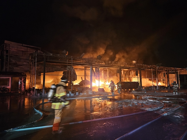 3일 오후 11시23분께 음성군 대소면의 한 휴대전화 배터리 필름 제조공장에서 불이 나자 소방대원들이 진화하고 있다.