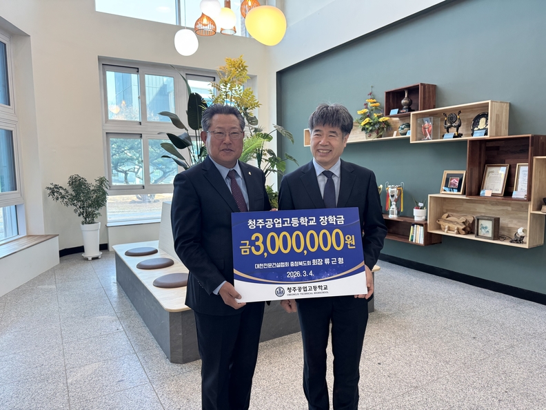 [충북일보] 류근형(34회·왼쪽) 대한전문건설협회 충북도회 회장이 4일 모교인 청주공업고등학교를 방문, 최진근 교장에게 학교발전기금 300만 원을 기탁하고 있다. 기탁금은 경제적 어려움을 겪는 학생들을 위한 장학금과 교육 여건 개선을 위한 지원금으로 활용될 예정이다.