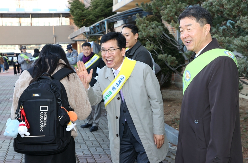 충북도교육청과 흥덕경찰서가 4일 오전 봉명고등학교에서 학교폭력 예방·도박 예방 캠페인을 실시하고 있다.