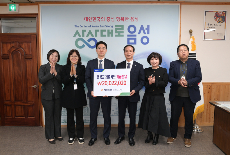 [충북일보] NH농협 음성군지부(지부장 홍승태)가 4일 음성군에 제휴카드 사용에 따른 적립기금 2천2만여 원을 전달하고 있다.