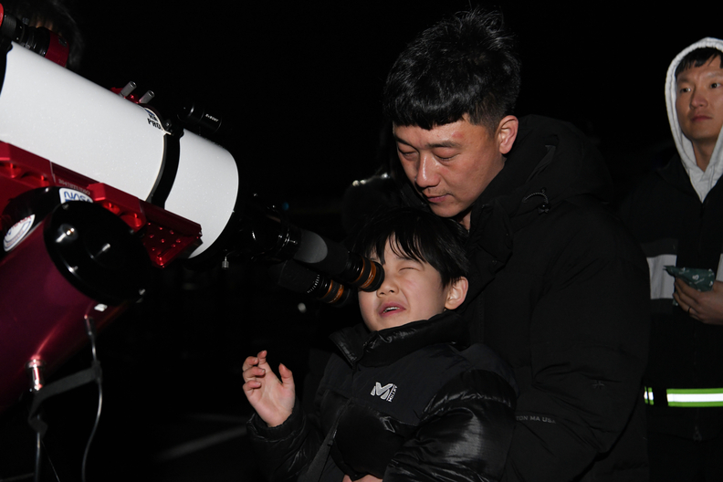 공군 17전투비행단이 실시한 ‘개기월식 및 천체관측 행사’에서 참석자들이 개기월식 현상을 관측하고 있다.