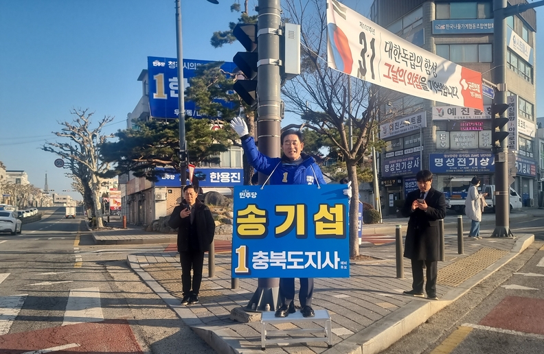 더불어민주당 송기섭 충북지사 예비후보가 4일 청주시 내덕칠거리에서 출근길 인사를 하고 있다.