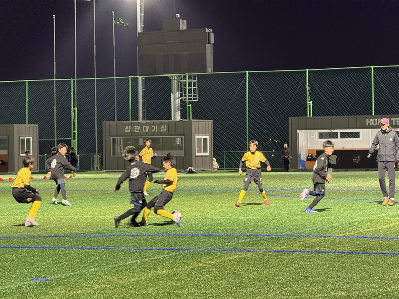 유소년 축구팀이 괴산 스포츠센터에서 야간훈련을 하고 있고 있다.