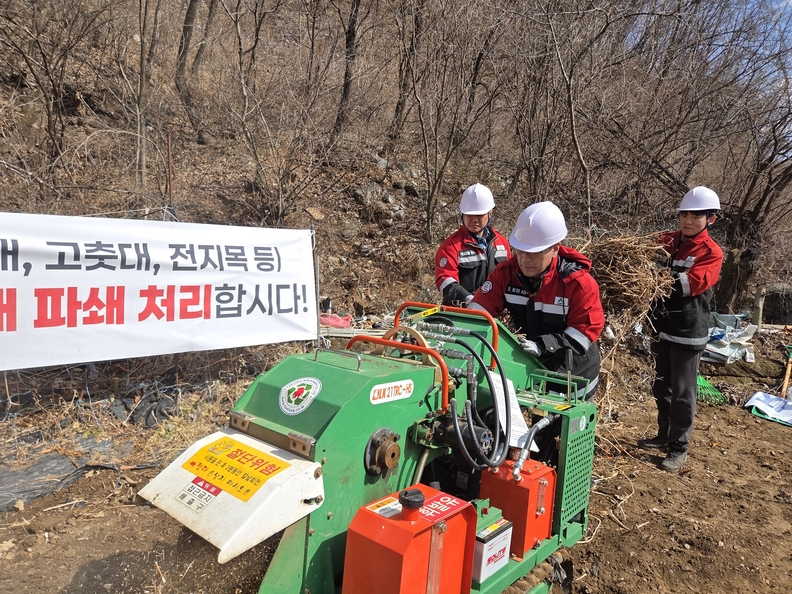 단양군산림조합 조합원들이 파쇄기를 이용해 영농부산물 파쇄 작업을 펼치고 있다.