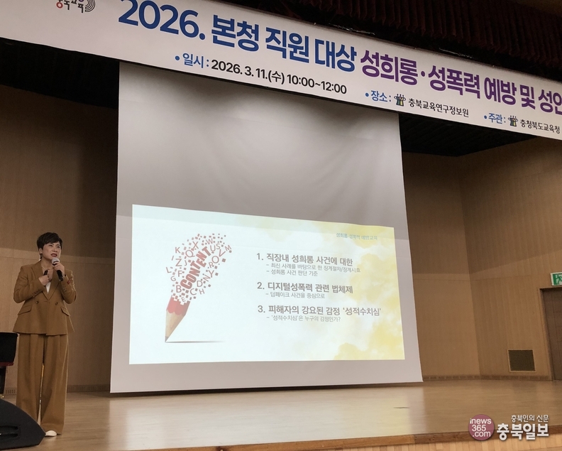 11일 오전 충북교육연구정보원 세미나실에서 박하연 수(秀)사와 젠더정의연구소 대표가 충북도교육청 본청과 교육연구정보원 직원들을 대상으로 성희롱·성폭력 예방 및 성인지 교육을 하고 있다.