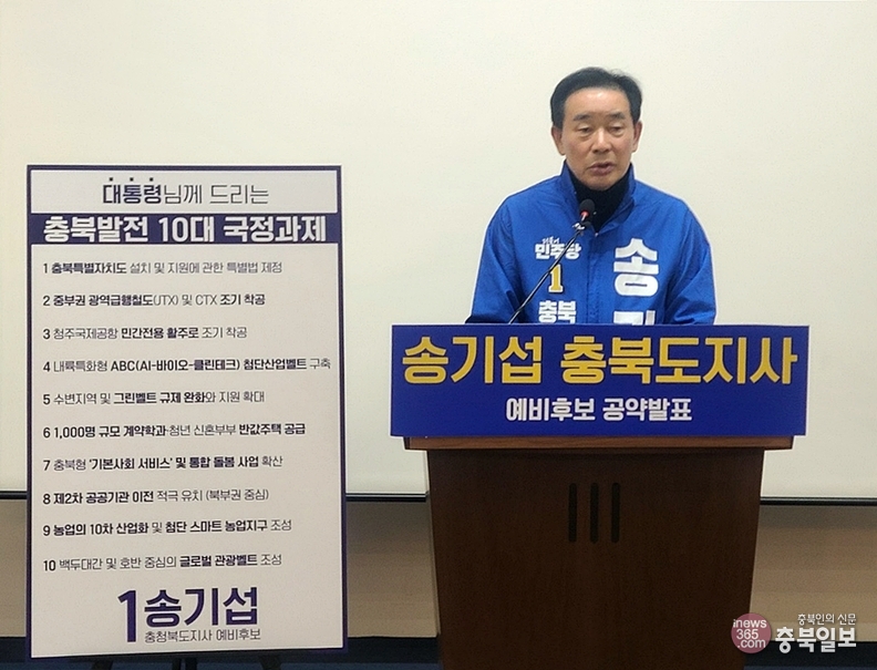 더불어민주당 송기섭 충북지사 예비후보가 12일 도청 브리핑룸에서 기자회견을 열어 충북 발전을 위한 10대 국정 과제를 제안하고 있다.