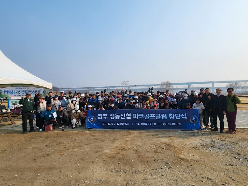 청주성동신협이 12일 파크골프클럽을 창단하고 회원들과 기념촬영하고 있다.