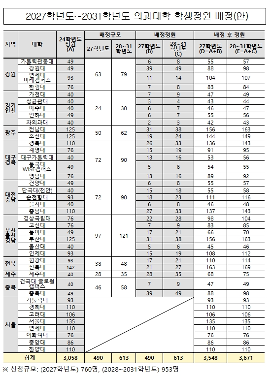 2027학년도~2031학년도 의과대학 학생정원 배정안.