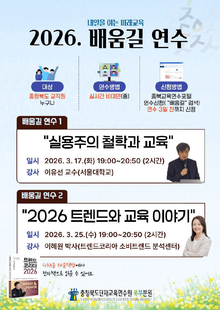 연수는 올해 총 10회에 걸쳐 교육 트렌드, 미래교육, 인문학 등 다양한 주제로 진행되며 충북도교육청 소속 교직원 누구나 충북교육연수포털에서 '배움길'을 검색해 연수 시작 3일 전까지 신청해 참여할 수 있다.