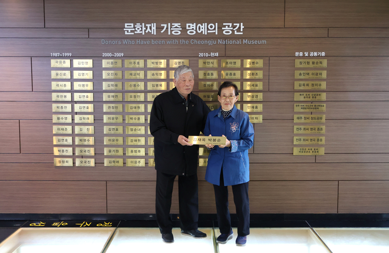청주 대성서점 대표 김재옥·박봉순 씨가 명예의 전당 명패를 들고 기념촬영을 하고 있다.